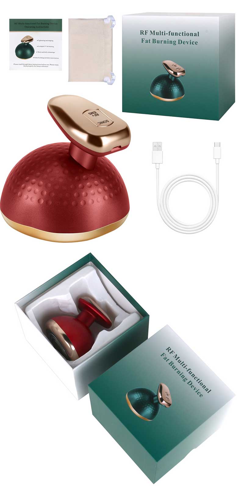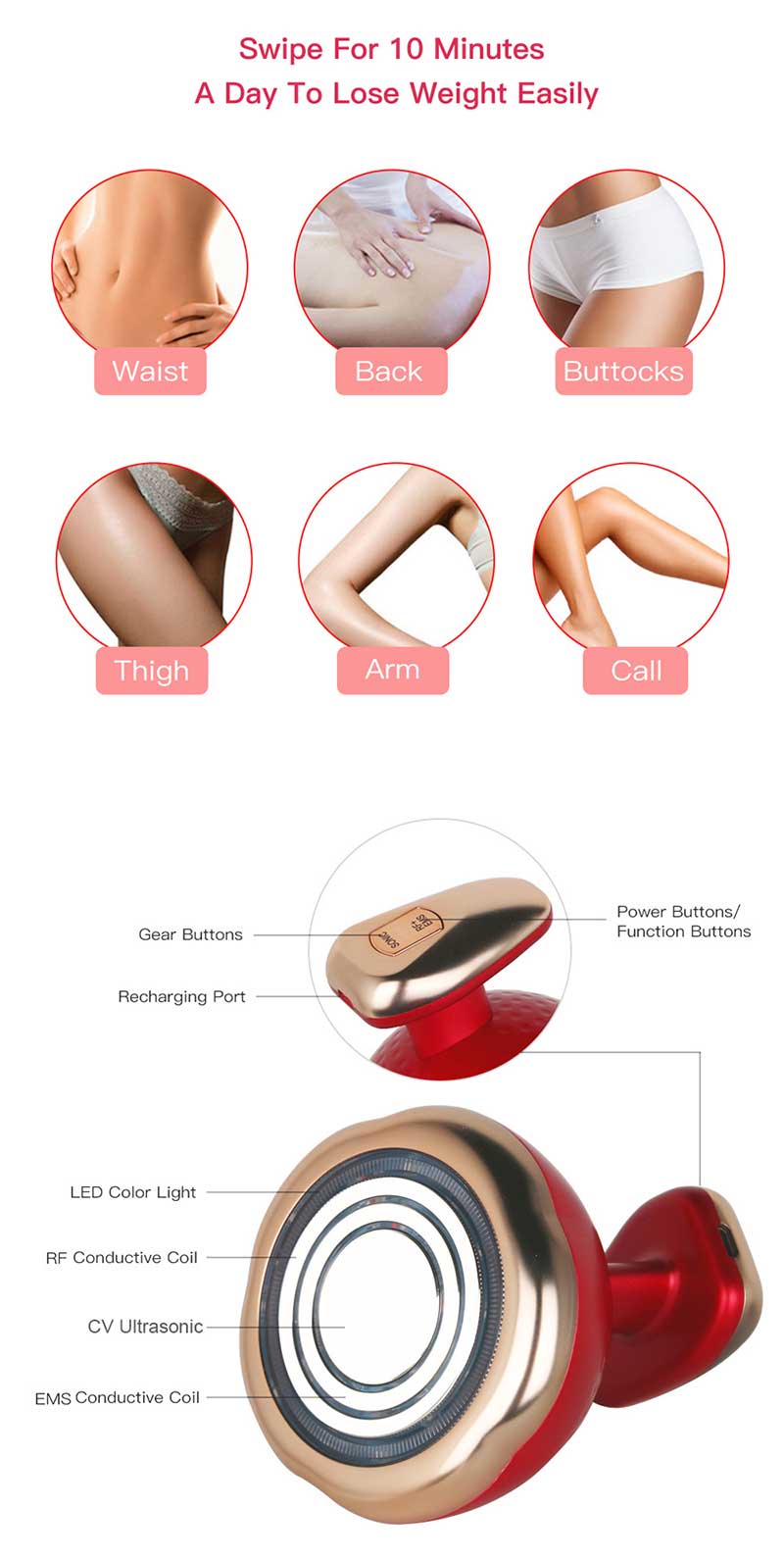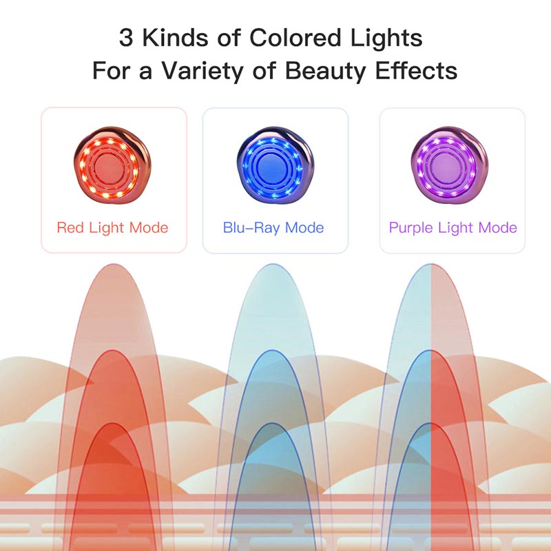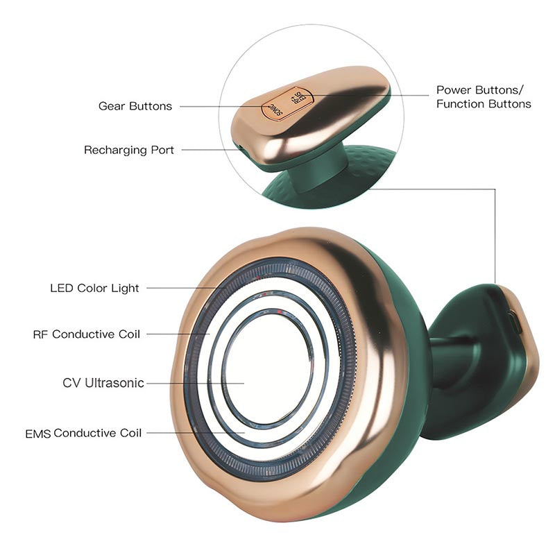The product is mainly features CV ultrasound waves, RF frequencies, EMS micro currents, LED color lights and high-frequency vibrations.