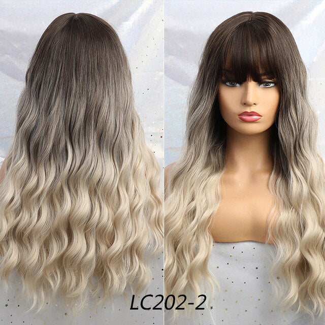Long Synthetic Water Wave Wigs with Bangs Dark Brown Ombre Grey Wigs Cosplay Heat Resistant Fiber False Hair