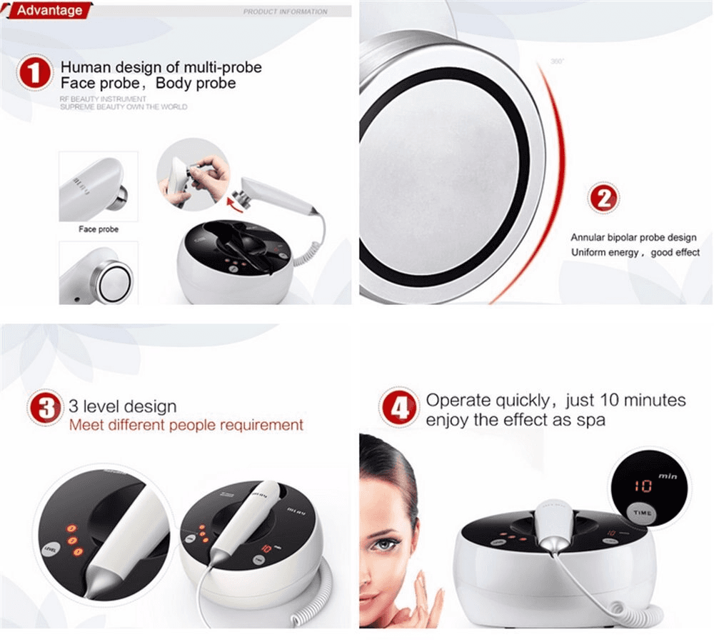 --SKIN TIGHTENING & FACE LIFTING & ANTI WRINKLE/SAGGING: Other non-surgical treatments only stimulate your facial muscles, the results don't last very long. Radio frequency skin tightening triggers your skin's ownhealing process. It stimulates the skin to produce elastin fibers and collagen that you have lost over the years.