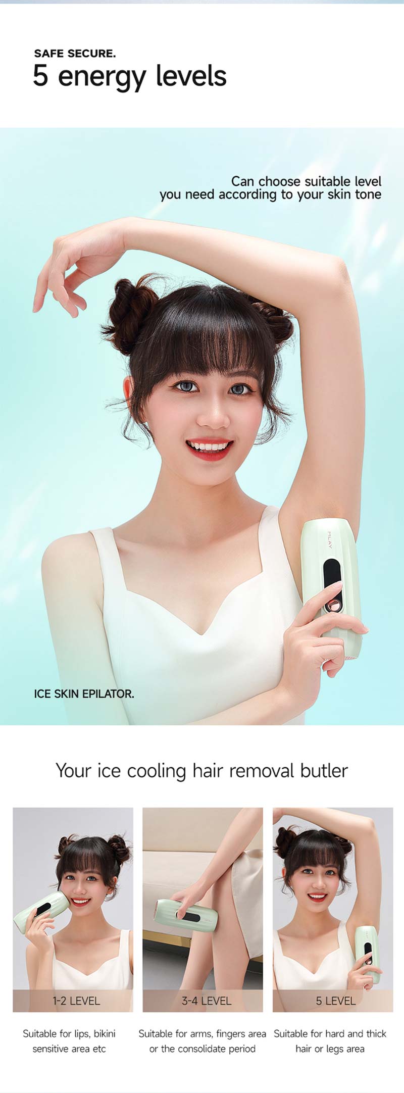 4. 500,000 service life, Can be used on face, legs, bikini area, arms, armpits