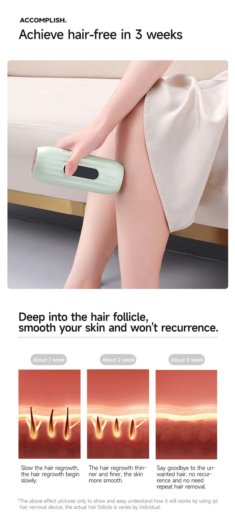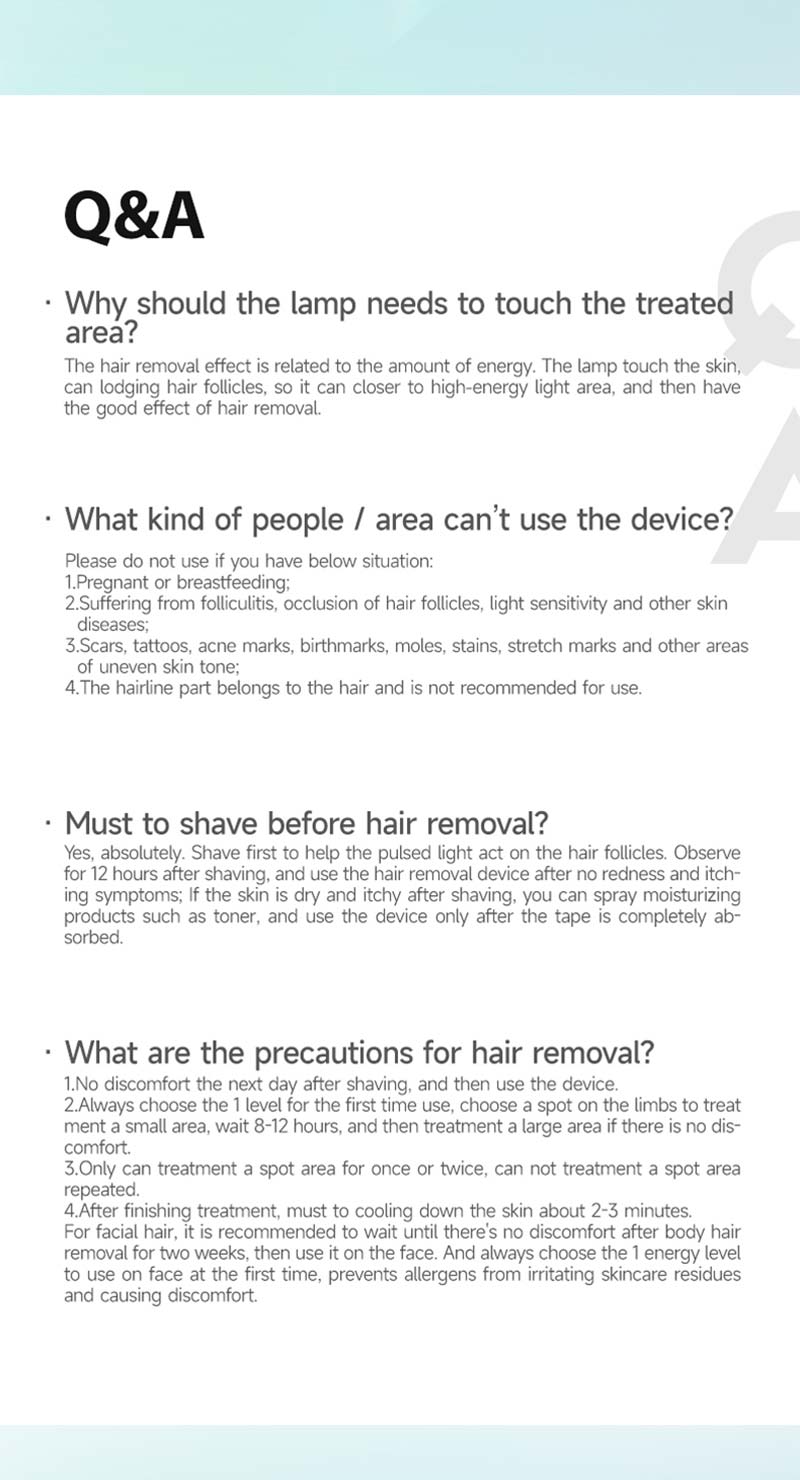 7. After our research on our products. According to statistics, about 86.5% of people can remove hair in just 5 times. About 83.2% of people need 8 times to remove hair. After 3-6 weeks of use, the hair is visibly reduced and the hair is not growing. After that we only need maintenance every two months or more.